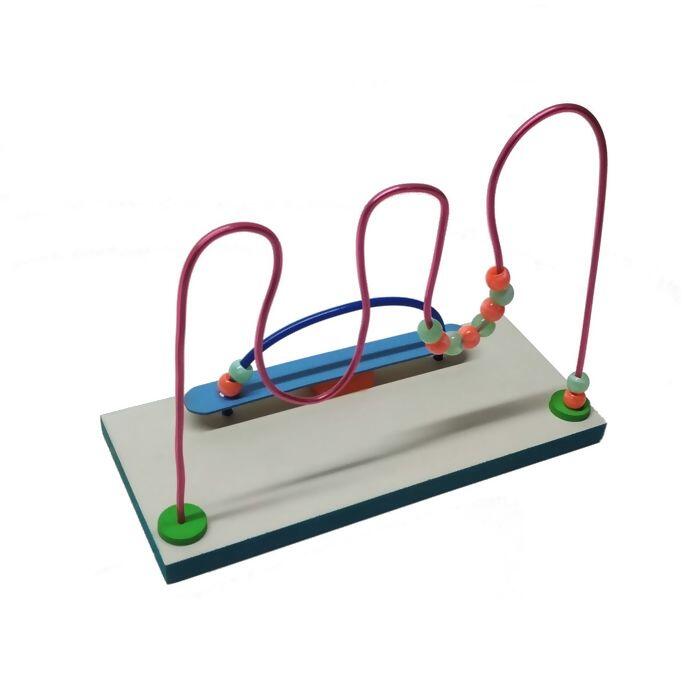 O objetivo desse brinquedo educativo é levar as pecinhas pelo aramado até o outro lado. Estimula a coordenação visomotora, a direcionalidade, a força e o controle do tônus muscular.