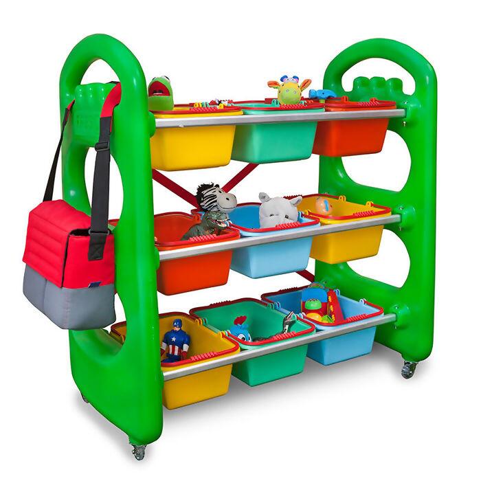 • Laterais com ressaltos na parte superior que funcionam como cabide e aberturas que permitem visualização lateral dos cestos