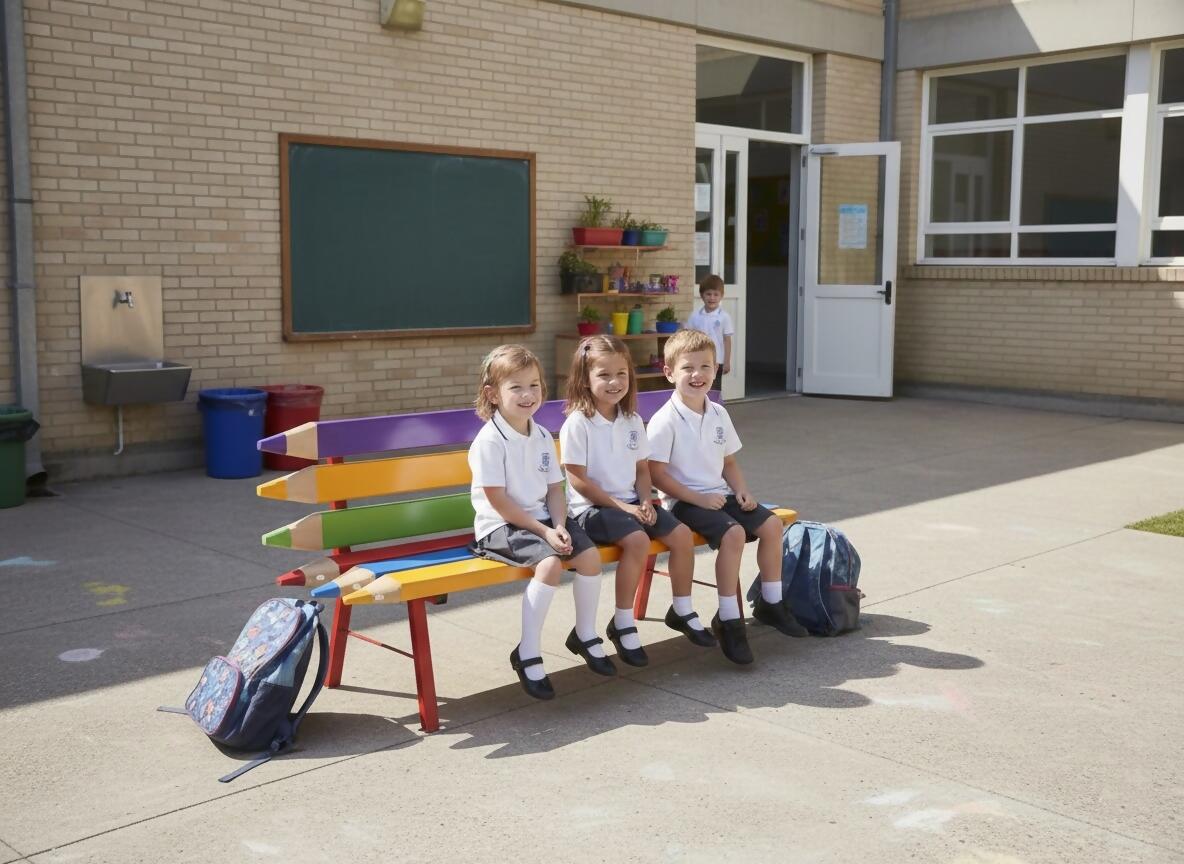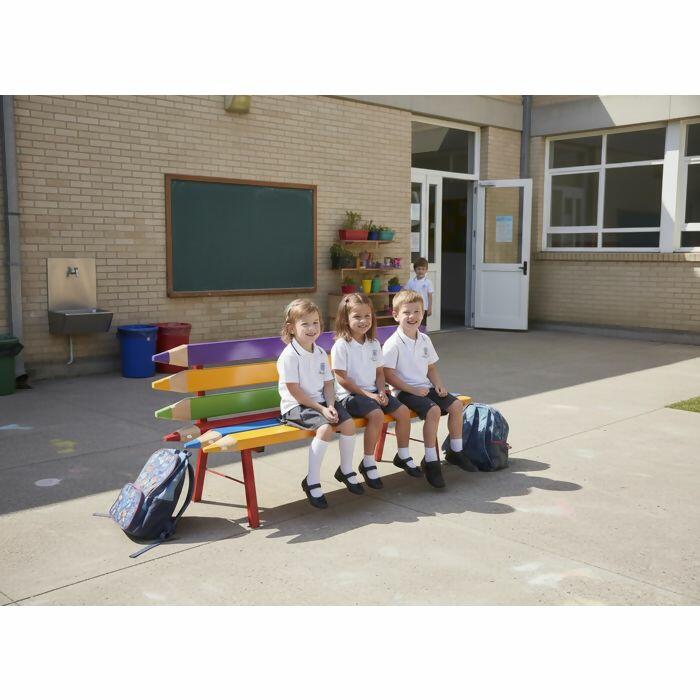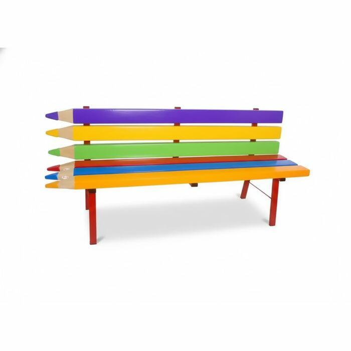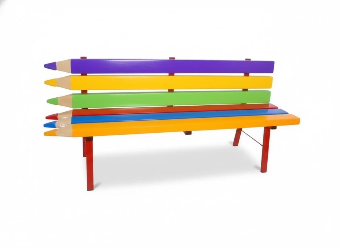 Banco infantil em forma de lápis multicolorido que auxilia no aprendizado das cores.