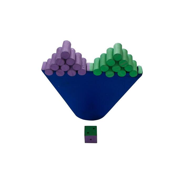 O objetivo do jogo é equilibrar as peças na base sem deixar cair. Acompanha 10 pinos verdes, 10 pinos lilás e 1 dado.
