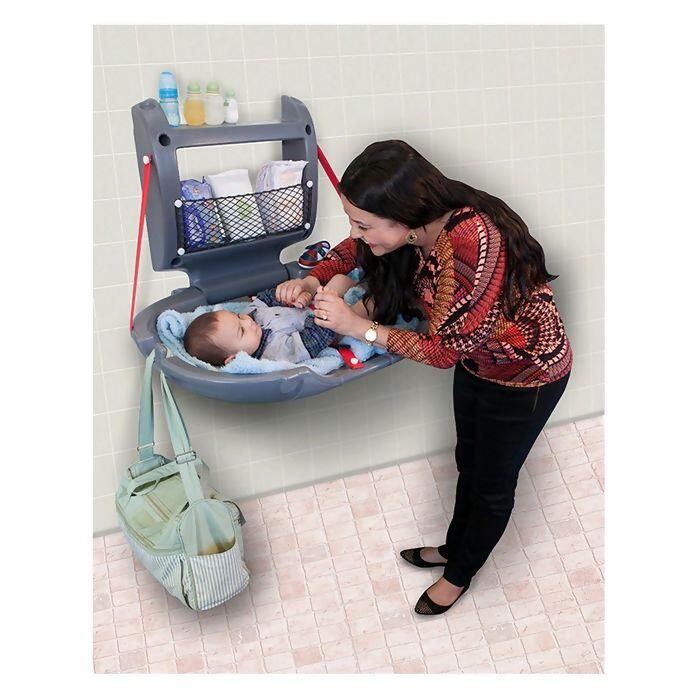 Conjunto basculante com fixação na parede que permite a troca de fraldas em bebês