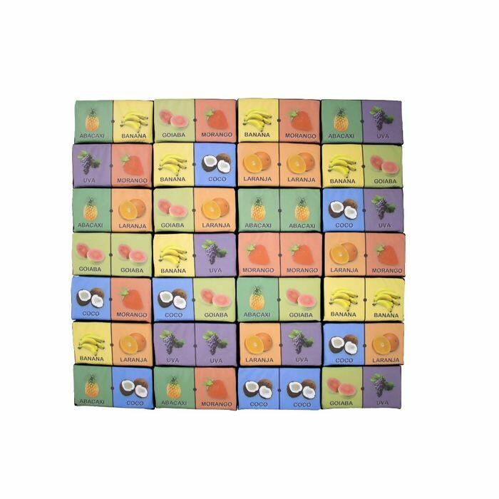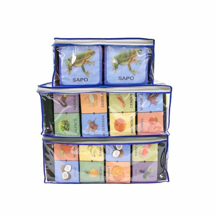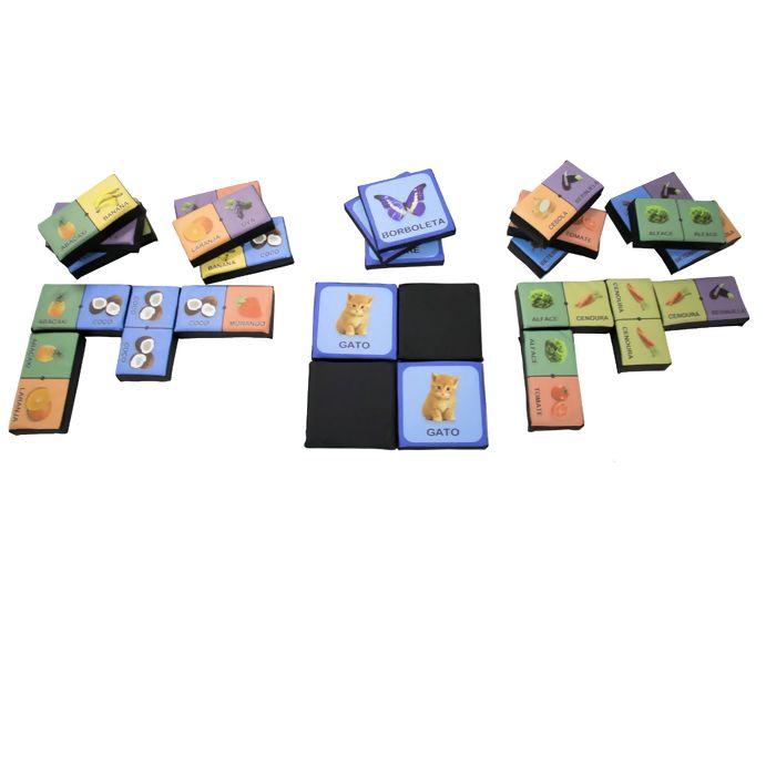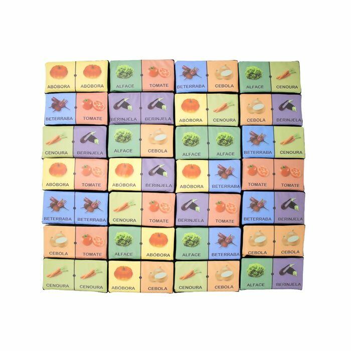 Kit composto por 3 jogos: Dominó de Frutas com 28 peças, Dominó de Vegetais com 28 peças e Jogo da Memória de Bichos com 20 peças. Confeccionados em espuma de densidade 20 revestida em bagum costurado. Acompanha bolsa plástica superflex 20mm para guardar o seu kit.