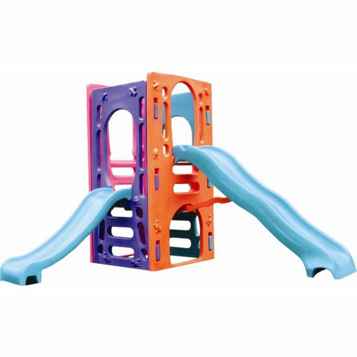 Playground infantil ideal para crianças de 4 a 9 anos que estimula a atividade física e o entretenimento entre as crianças, além de possuir: 1 módulo; 2 escorregadores (pequeno e grande); escadas de acesso aos escorregadores na própria estrutura; aberturas na parte inferior do brinquedo, com área livre para diversão e é ideal para espaços como buffets, escolas, condomínios e espaço Kids.