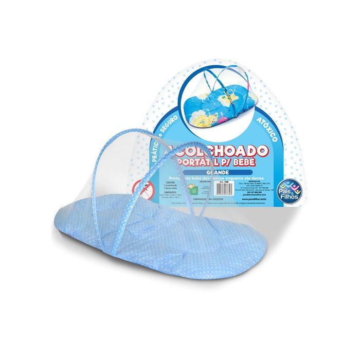 Descrição Acolchoado Portátil Grande para Bebê com Mosquiteiro - Azul Pais e Filhos (7760)