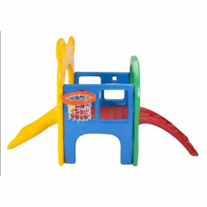 Playground com atividades para a total diversão dos pequenos que possui: escorregador de 80 cm de altura, escalada de 81 cm de altura, cesta de basquete de 30 cm, futebol-gool de ambos os lados, área de descanso.