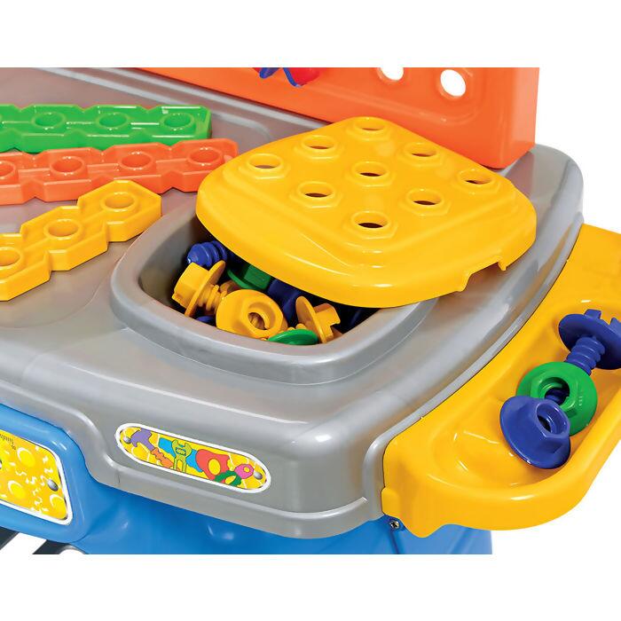 Esta bancada é completa, equipada com várias ferramentas e acessórios.Estimula a criatividade e o raciocínio na resolução de problemas. Acompanha um kit com alicate, chave de fenda, chave de boca, chave inglesa, serrote que faz barulho igual ao de verdade, martelo, parafusos e porcas.