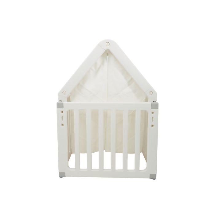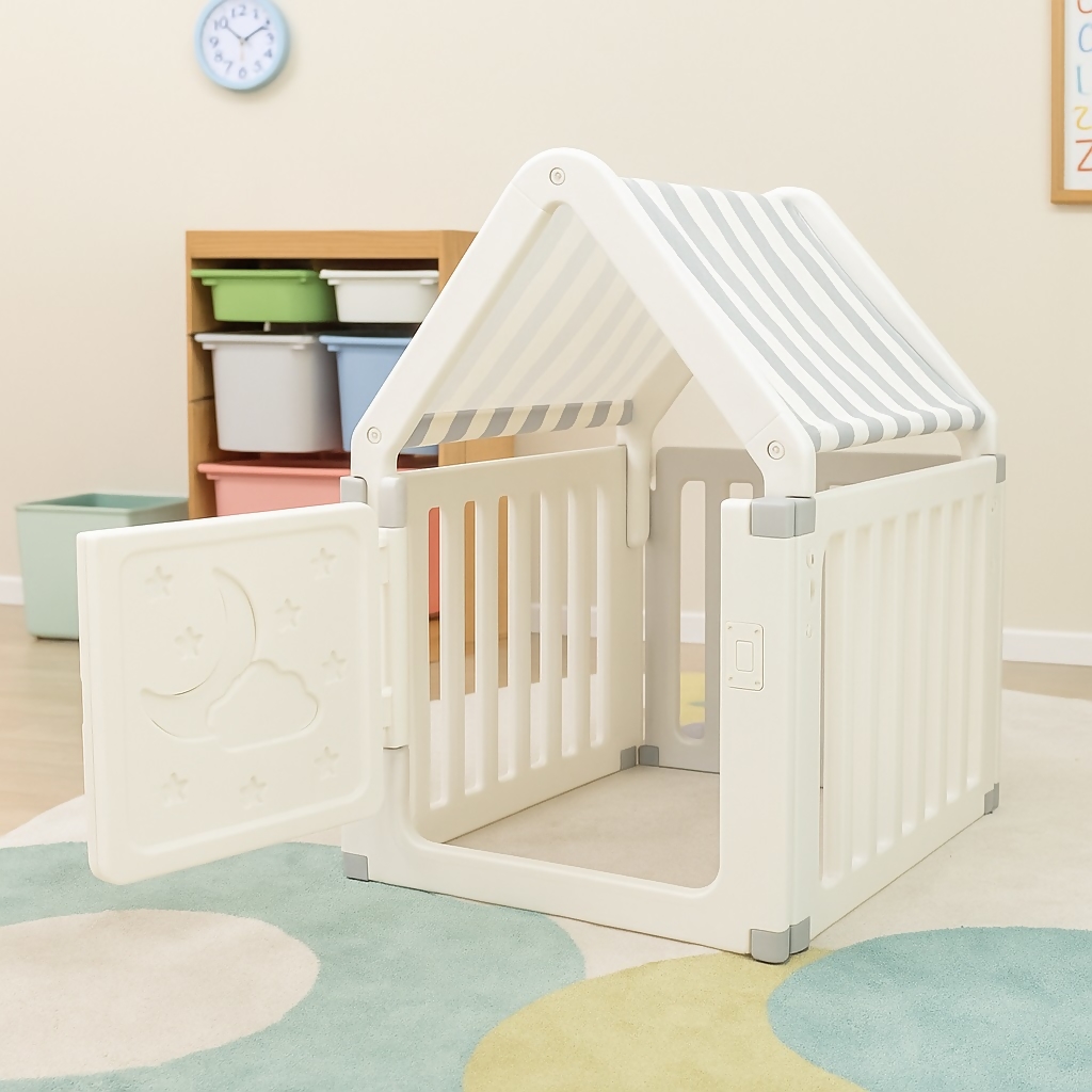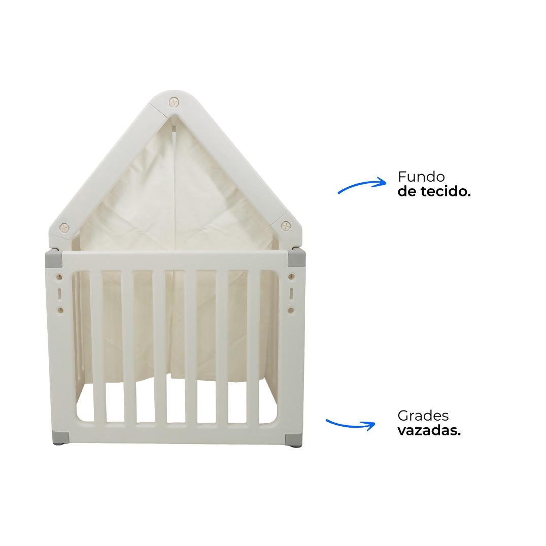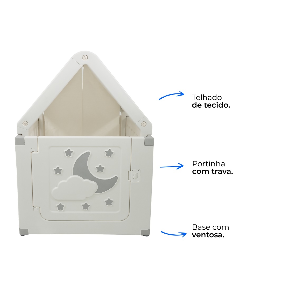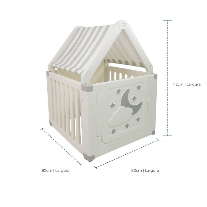 O telhado em tecido listrado traz um toque de charme e aconchego, tornando o espaço ainda mais convidativo para a imaginação das crianças. Com porta interativa decorada com lua, nuvens e estrelas, a casinha estimula o faz de conta e o desenvolvimento criativo.