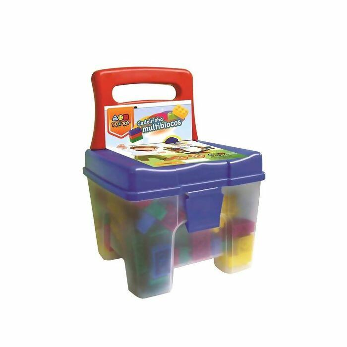 Ela acompanha 30 blocos de montar, 01 cadeirinha e seu assento, que é usado como baú para guardar brinquedos.