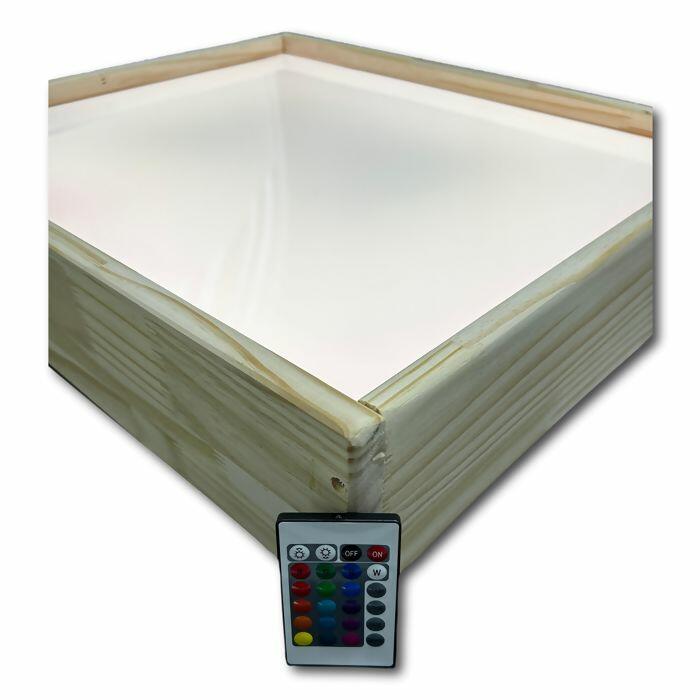 Madeira de pinus de 18mm, acrílico pingo de leite de 2mm, luz de LED colorido, com controle remoto, acabamento interno e externo, nas medidas;
