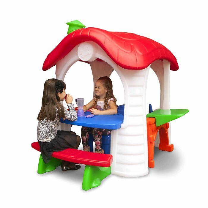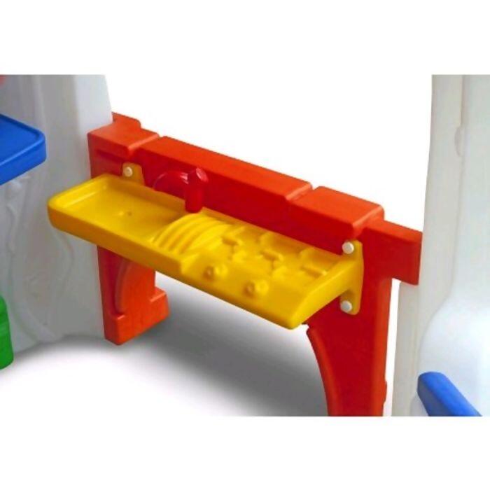 Na parte externa da casinha as crianças poderão brincar na mesinha e banquinho acoplados em uma das paredes.