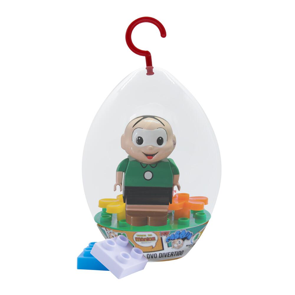 Embalagem em formato de Ovo de Páscoa com um lindo boneco do Cebolinha dentro + 4 bloquinhos de montar para as crianças se divertirem.