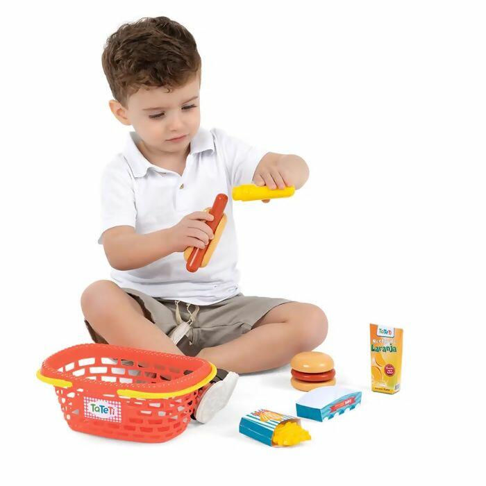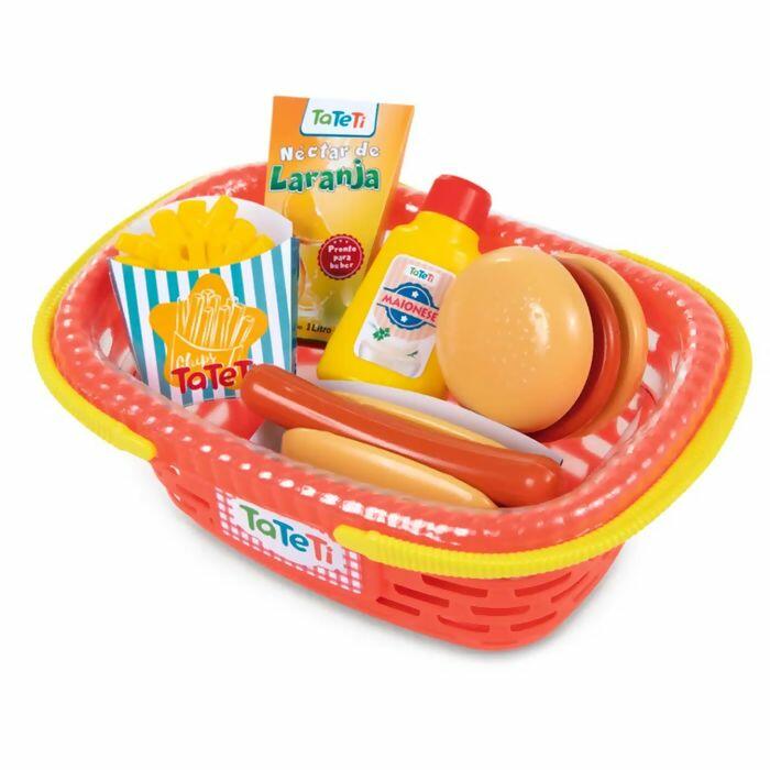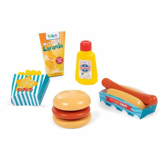 Cheio de sabor e diversão, este kit traz um hamburguer, um cachorro-quente, batata frita, uma caixinha de suco, uma bisnaga de ketchup, maionese e mostarda. Tudo para uma refeição de brincadeira completa!