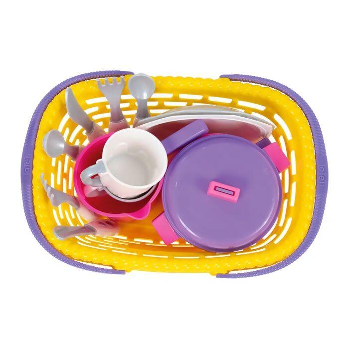 Essa cestinha incrível vem com duas xícaras, dois pratos, uma leiteira, uma panela, um escorredor e talheres variados. Tudo o que os pequenos precisam para se sentirem grandes chefs na cozinha!