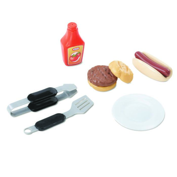 Contém: 1 ketchup, 1 hambúrguer, 1 cachorro quente, 1 pegador de cozinha, 1 espátula e 1 prato.