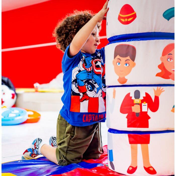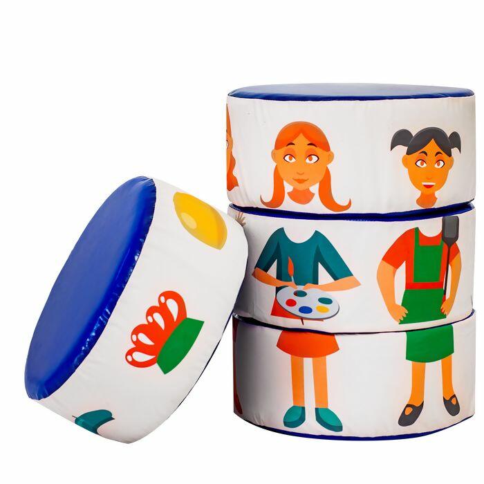 Conjunto confeccionado em espuma de alta performance revestido em bagum impermeável resistente. São 4 peças coloridas impressas digitalmente com as profissões de policial, médico, repórter, pintora, chef e construtor para a criança montar.