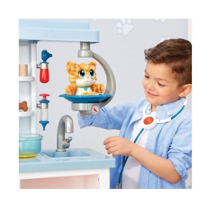 Com 15 acessórios inclusos: 1 gato e 1 cachorro de pelúcia, tartaruga e tigela, medidor de pressão arterial, estetoscópio, seringa, otoscópio, bandagem, cone de animal, osso, 3 lâminas de raio x e 1 marcador.