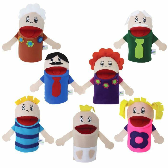 Conjunto com 7 fantoches: Avô, Avó, Pai, Mãe, Menino, Menina e Bebê.
