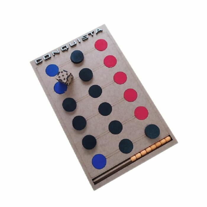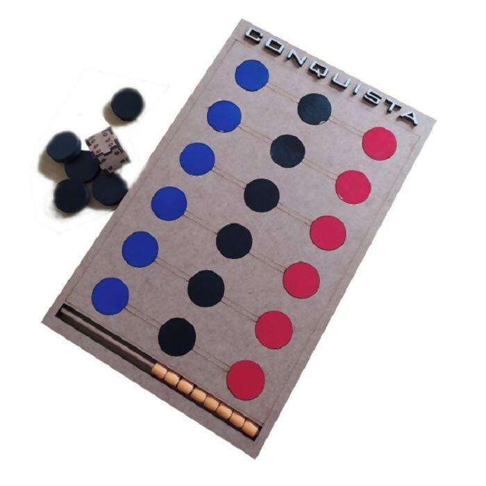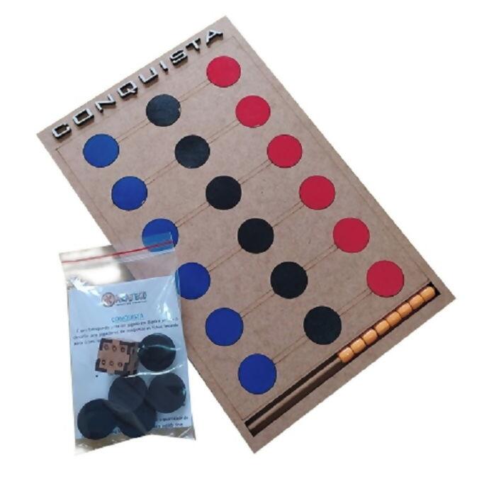 Conquista é um jogo educativo. O objetivo do jogo é conquistar todas as fichas de cor preta para seu lado escolhido (vermelho ou azul). estimula a coordenação motora, concentração, raciocínio lógico e estratégia. Produzido em madeira tipo MDF.