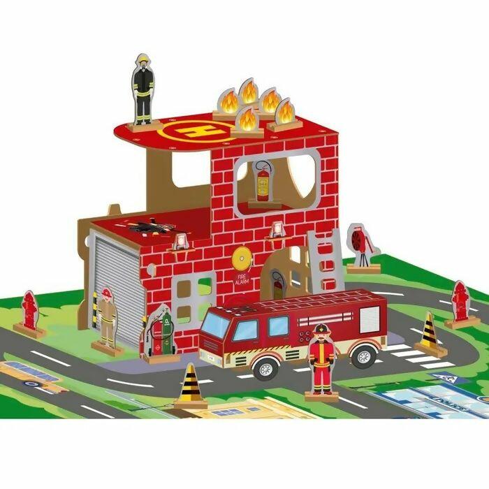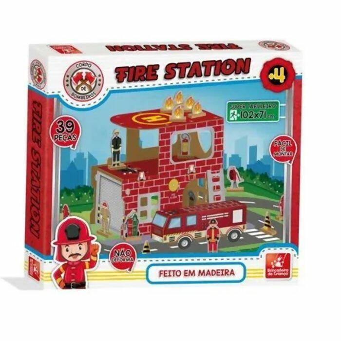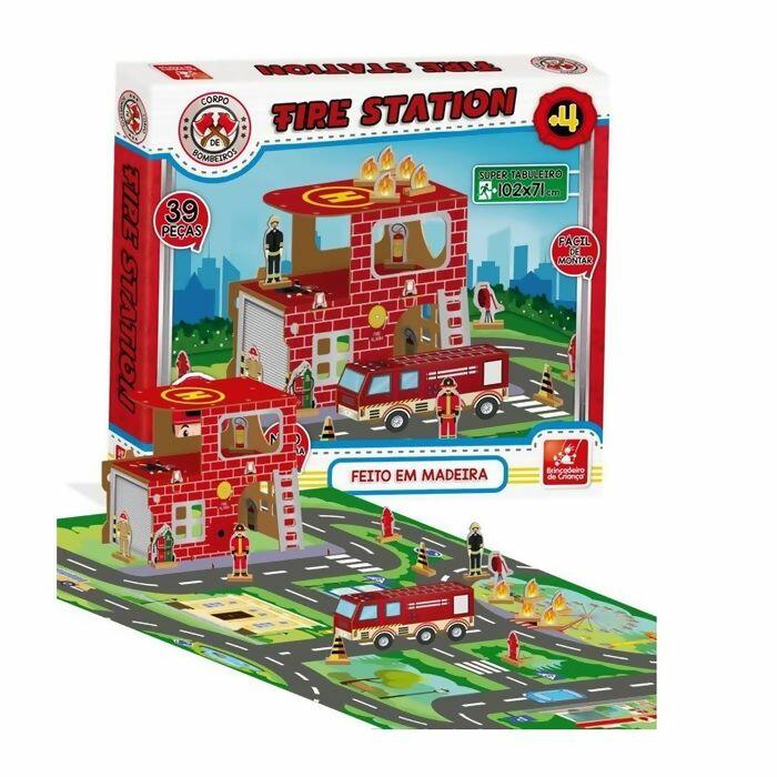 O Corpo de Bombeiros Fire Station é feito de madeira composto por: 1 (um) super tabuleiro (102 x 71 cm montado), 1 (um) manual de montagem e 39 peças para montar.