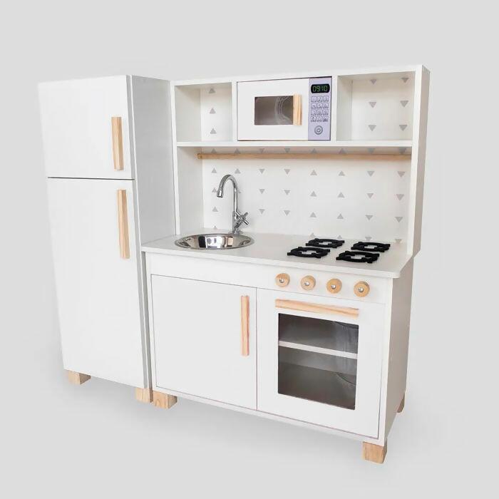 Com um lindo cooktop de 4 bocas e botões que giram, pia com torneira, portas que abrem e fecham, micro-ondas e forno com visualização interna, armário e geladeira com bastante espaço para guardar os utensílios de cozinha, e porta toalha, a brincadeira fica completa!