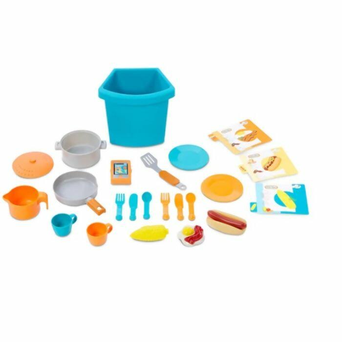 Contém: 1 lixo, 1 milho, 1 cachorro quente, 1 ovo, 2 pratos , 2 xícaras, 2 garfos, 2 facas, 2 colheres, 1 frigideira, 1 leiteira, 1 panela com tampa, 1 telefone, 1 espátula e 3 receitas.