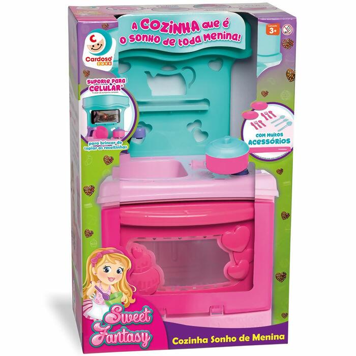 A Sweet Fantasy Cozinha Sonho de Menina é uma cozinha completa que estimula a imaginação e criatividade das crianças. Ela tem cooktop, pia com torneirinha lúdica, forno com porta abre e fecha, escorredor de pratos, pratinhos, panelinha, utensílios domésticos e um grande diferencial na coifa decorativa. Nela há um suporte para celular, onde a criança também pode brincar de imitar as receitinhas dos sites, igual à mamãe! Com celular ou sem celular a brincadeira é garantida! Conteúdo: A Cozinha Sonho de Menina vem com 1 panela com tampa, 2 pratos, 1 espátula, 1 concha, 1 escumadeira, 2 garfos, 2 facas e 2 colheres e cartões pop-up para recortar no verso da embalagem.