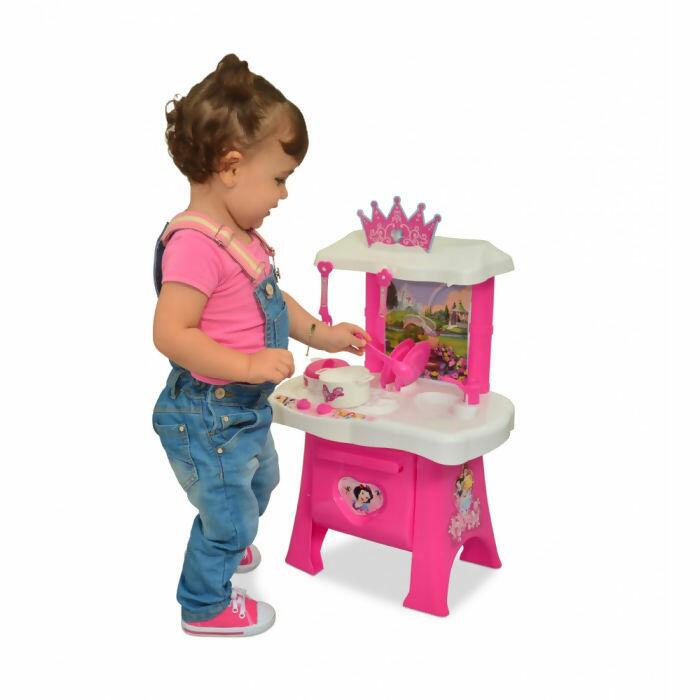 Mini cozinha com tema das Princesas, com pia, fogãozinho com botão que faz barulho creck-creck , forno e coifa. Tudo o que as crianças precisam para se divertir. Acompanha utensílios como pratos, talheres, panela e frigideira.