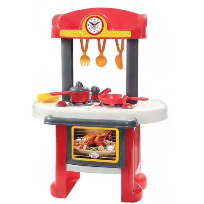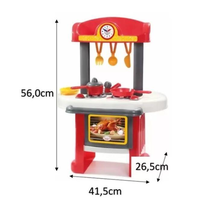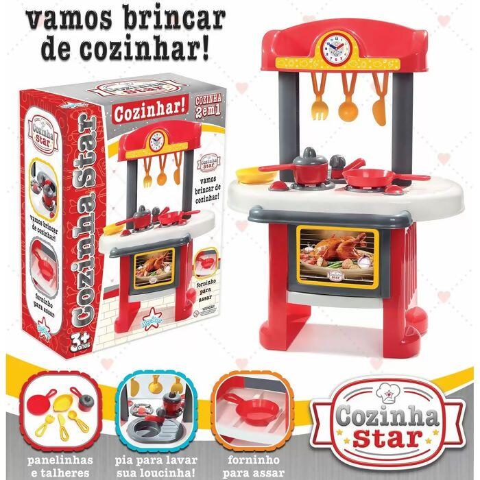 A Cozinha Star possui duas bocas de fogão com grelhas pretas, pia, forno, e diversos utensílios básicos. O forno portinha que abre e fecha. Tudo para deixar a brincadeira a mais real possível.