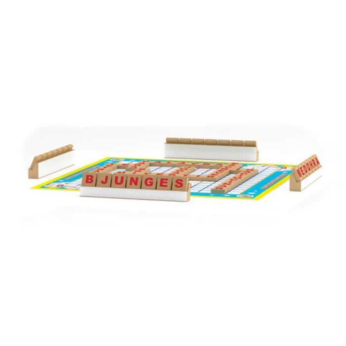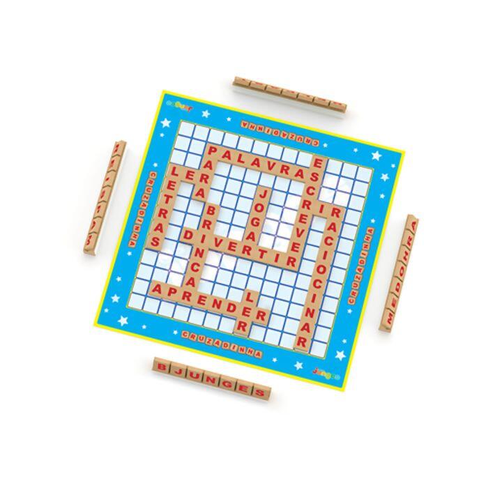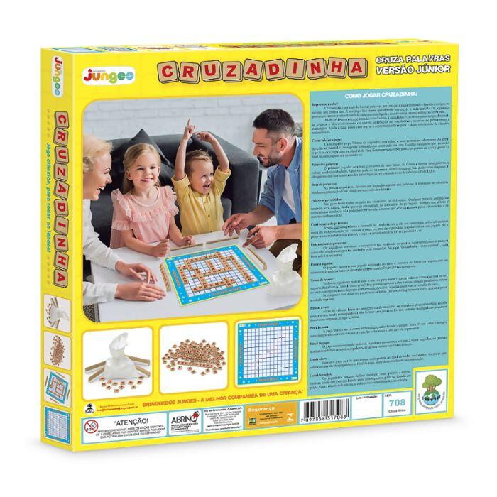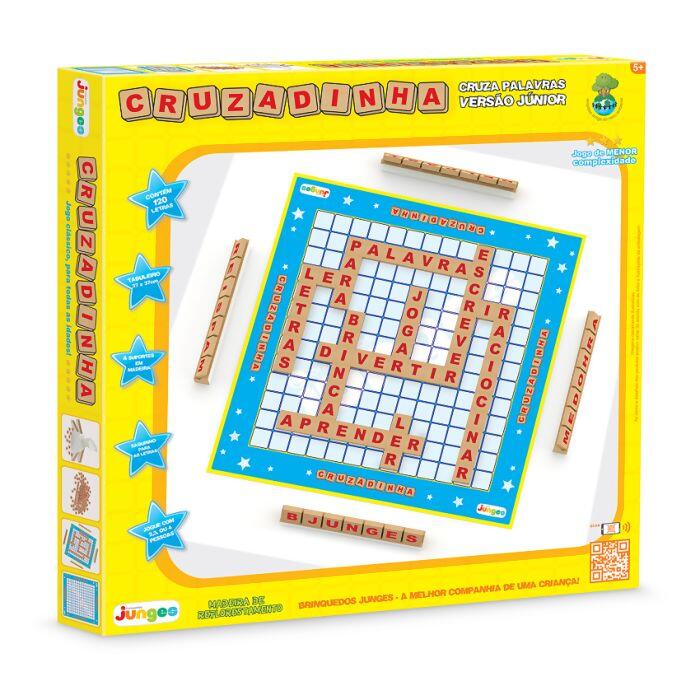 Cruzadinha Junges A Cruzadinha Junges é um jogo tradicional recomendado para crianças em fase de alfabetização. Ideal para letramento e formação de palavras, estimulando a criatividade, imaginação e raciocínio. Fabricada em peças de madeira MDF de 6mm - 2 x 2cm e impressos em serigrafia, o jogo acompanha:- 120 letras;- 1 tabuleiro de papel cartão em tamanho 37 x 37 cm;- 4 suportes para letras;- 1 saco plástico para armazenar as peças.Capacidade para até 4 jogadores.