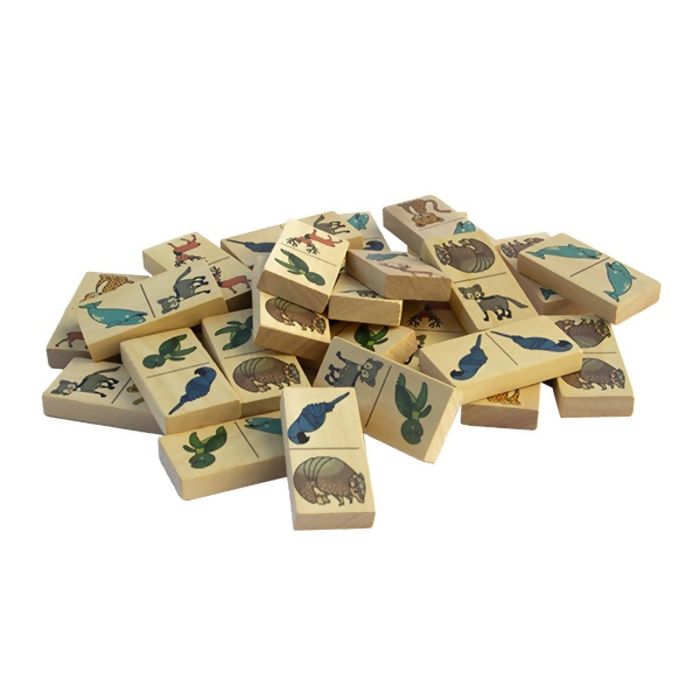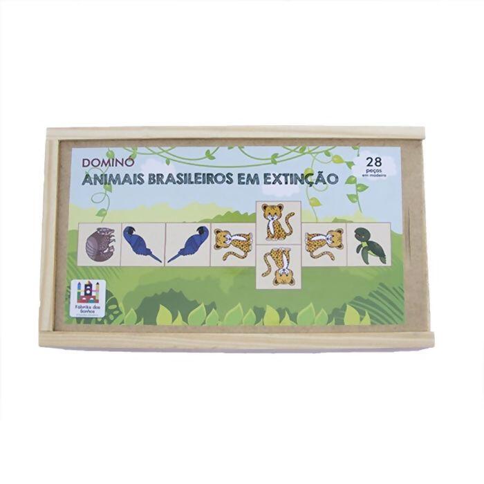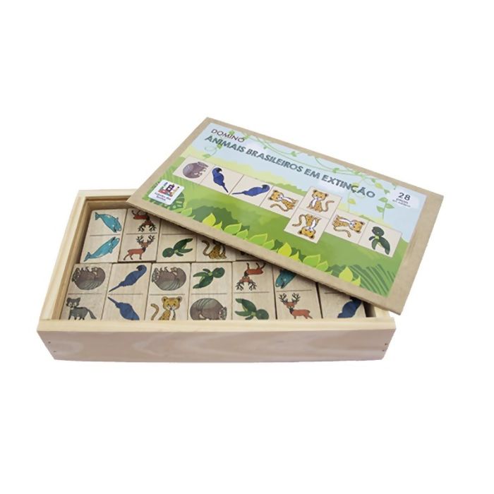 Dominó no tema de animais brasileiros em extinção, contendo uma caixa e 28 peças de 6 x 3 cm cada. Confeccionado artesanalmente em madeira de reflorestamento. Nossos brinquedos são elaborados para atender diversas idades e feitos a mão.