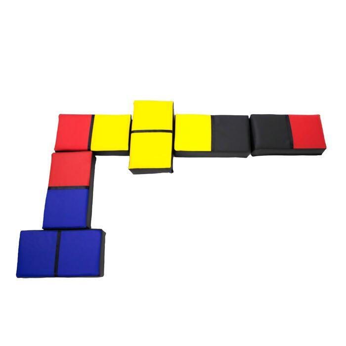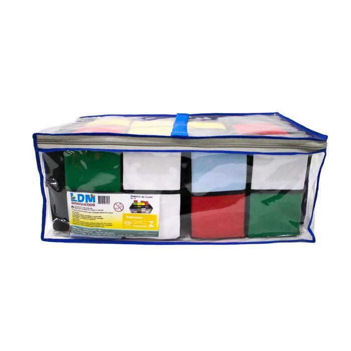 Dominó com 28 peças confeccionado em espuma e revestido com bagum. Acompanha bolsa plástica transparente para guardar.