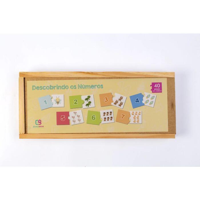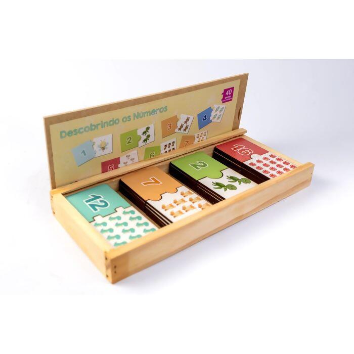 Dominó em madeira ilustrado no tema Descobrindo Números, com 40 peças.