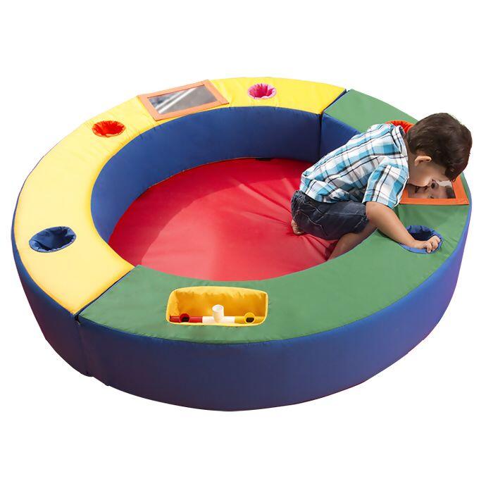 Confeccionado em espuma de alta performance revestido em bagum impermeável colorido e resistente fixados com velcro entre 3 peças: uma parede com de 20cm de espessura contendo 6 orifícios, e duas peças em plástico transparente para incluir atividades.