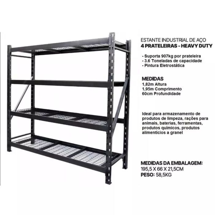 - Ideal para uso profissional ou doméstico, essa estante é a escolha certa para quem busca resistência e praticidade. Garanta o seu espaço organizado com eficiência e segurança!