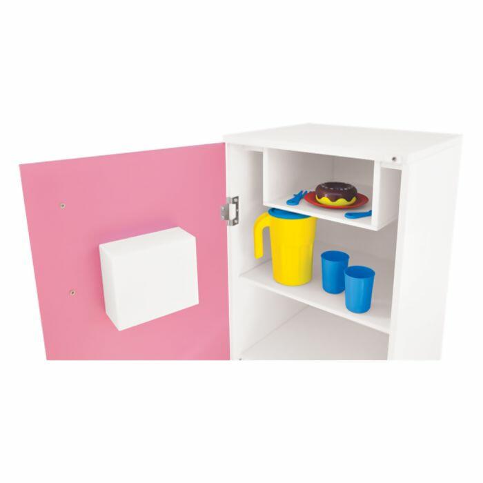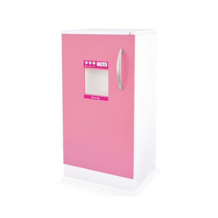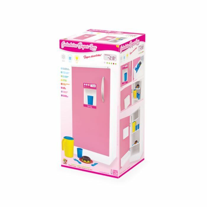 Geladeira Super Lux Rosa Junges Conheça a Geladeira Super Lux Rosa Junges! Fabricado em madeira MDF, ele possui decoração e pintura atóxica. A geladeirinha dispõe de prateleiras removíveis, freezer, dispenser e porta-garrafas. Acompanha jarra, bolo e copos para deixar a brincadeira ainda mais divertida!