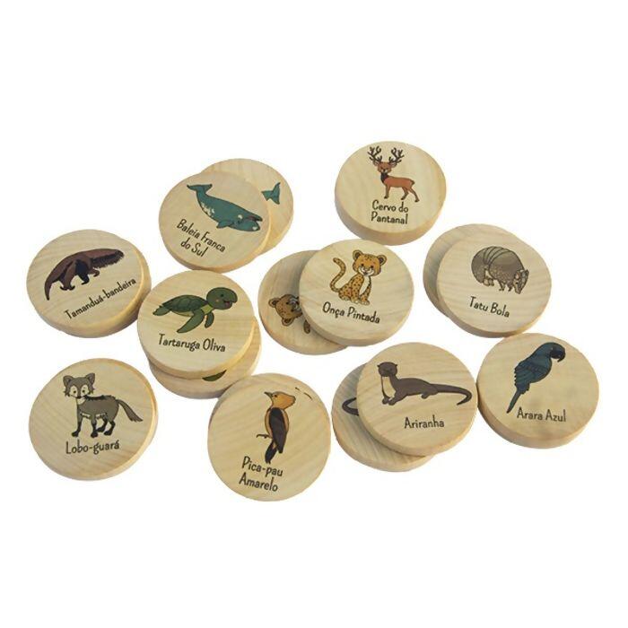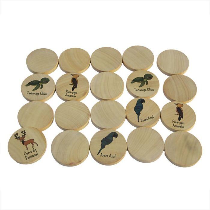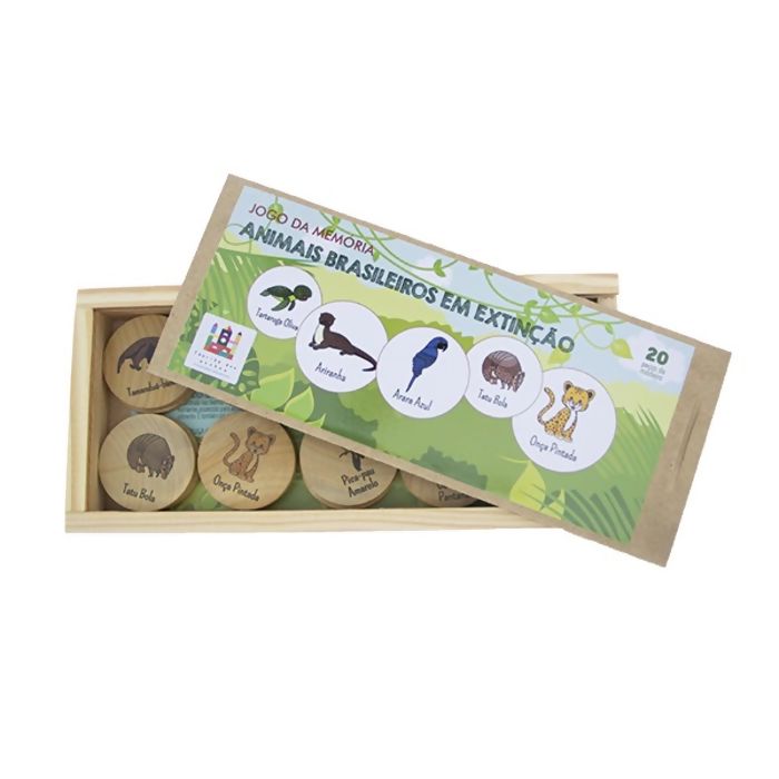 Jogo da memória no tema de Animais brasileiros em extinção, contendo uma caixa e 20 peças, ou seja, 10 personagens com duas peças de cada um. Confeccionado artesanalmente em madeira de reflorestamento. Nossos brinquedos são elaborados para atender diversas idades e feitos a mão