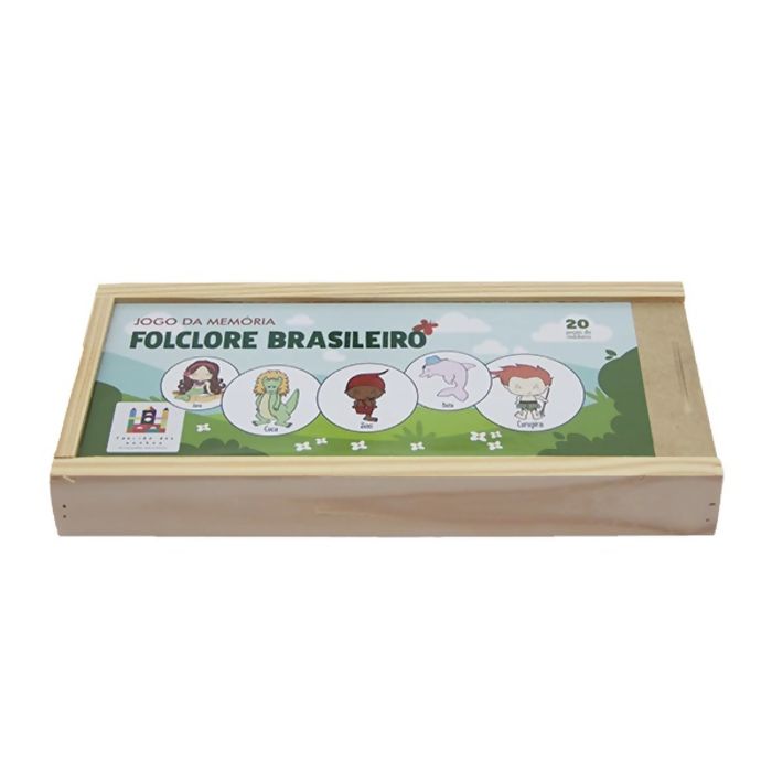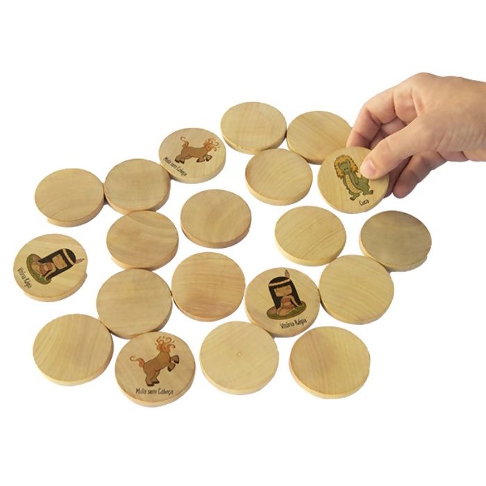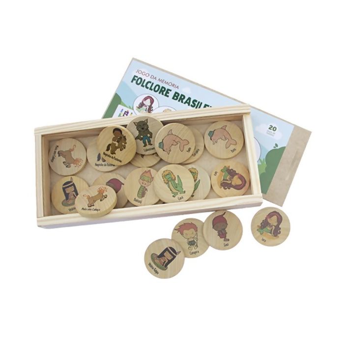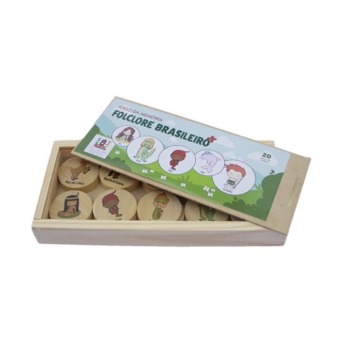 Jogo da memória no tema de folclore brasileiro, contendo uma caixa e 20 peças, ou seja, 10 personagens com duas peças de cada um. Confeccionado artesanalmente em madeira de reflorestamento. Nossos brinquedos são elaborados para atender diversas idades e feitos a mão.