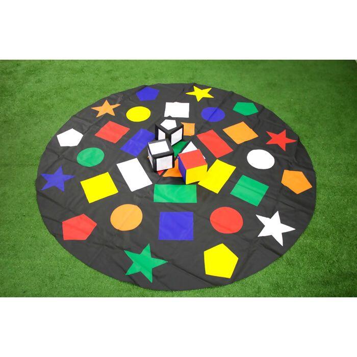 Tapete circular com formas geométricas costuradas e três dados para a criança brincar e aprender ao mesmo tempo.