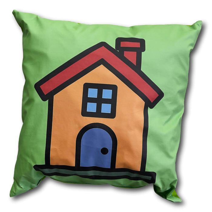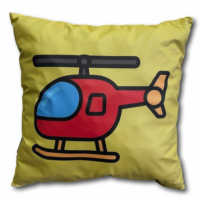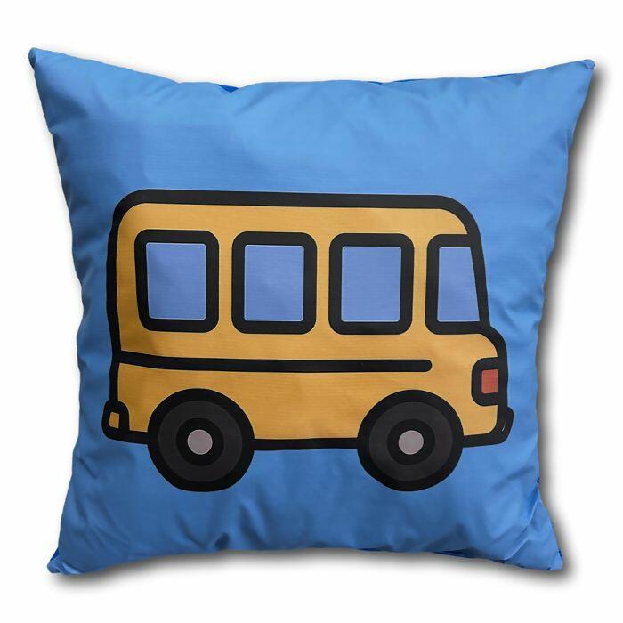 Kit com 4 almofadas infantis 40x40 coloridas e com figuras: ônibus, casinha, helicóptero e foguete.