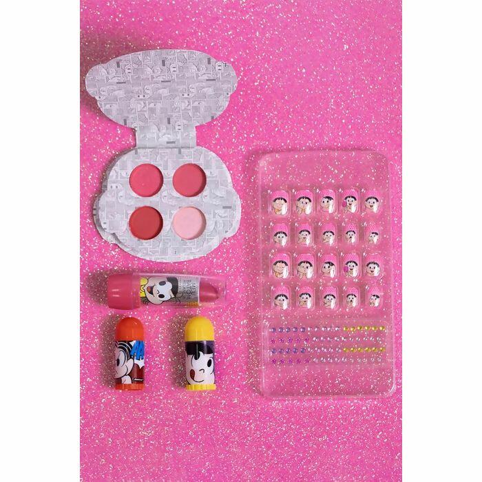 1 Cartela com 20 unhas postiças de plástico autoadesivas + Kit decorativo autoadesivo (11gr), 2 unidades de Lip Balm (2,5gr) , 1 Batom (3,5gr) e 1 Paleta de Sombras (4gr). (cores sortidas)