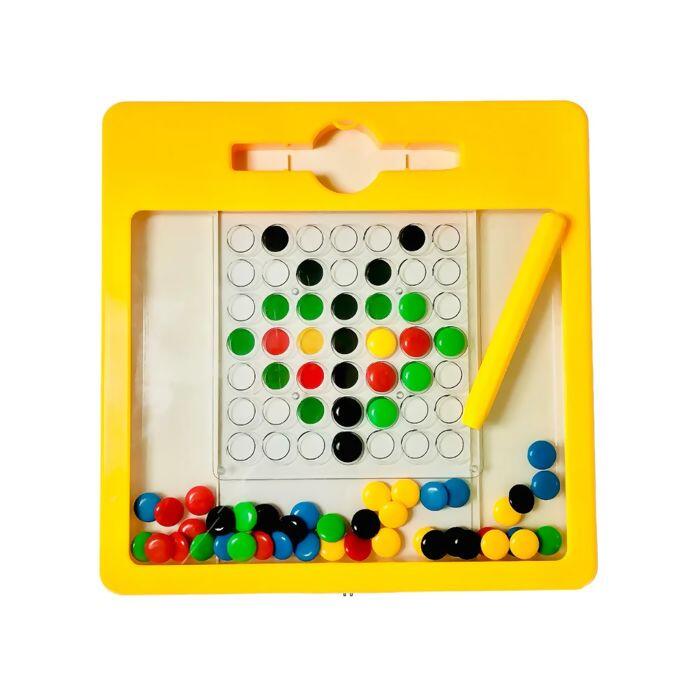 Inclui: 1 base de montagem com diversas bolinhas coloridas, 1 caneta magnética e 14 desafios