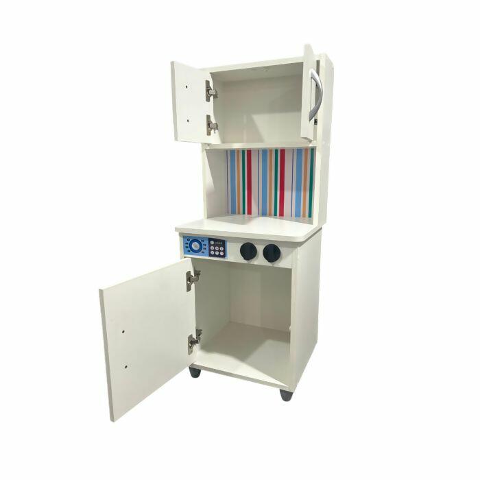 Módulo em madeira MDF 15mm, com armário e máquina de lavar com portinhas que abrem e fecham.