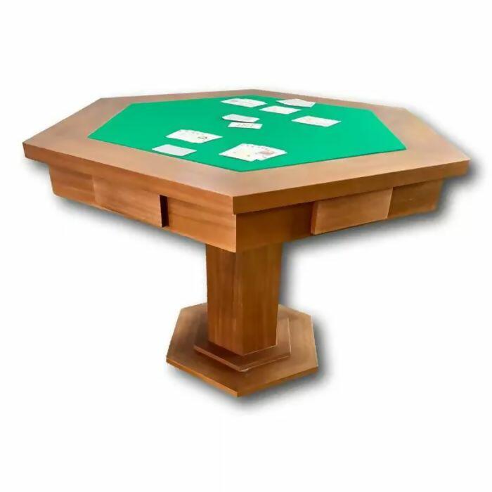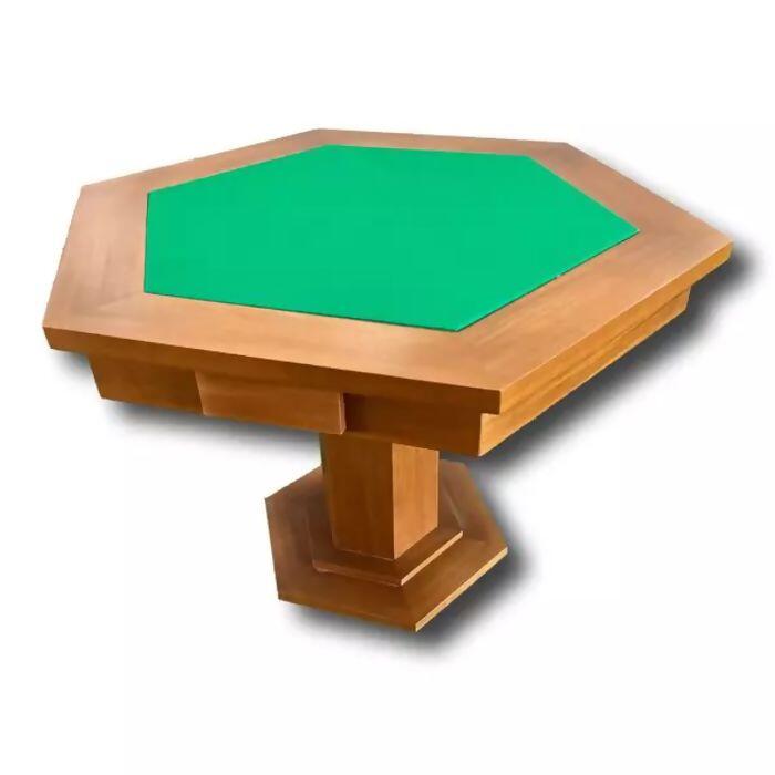 Mesa de carteado sextavada fabricada em madeira maciça cedrinho com excelente acabamento em verniz acetinado.