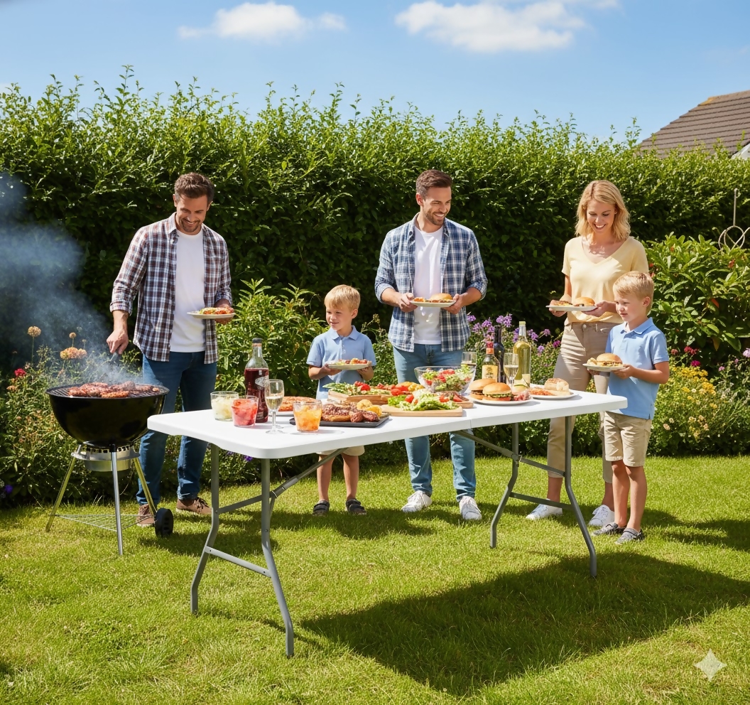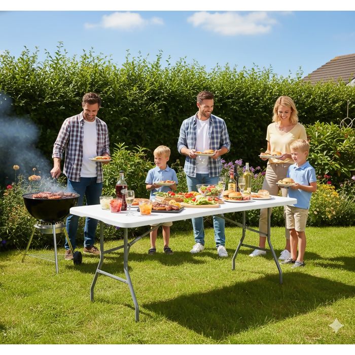 Seu grande diferencial está no tampo ultra reforçado de 3,5 cm de espessura, o mais grosso da categoria, fabricado em plástico HDPE de alta densidade, capaz de suportar até 150 kg de carga distribuída sem empenar ou deformar — algo que mesas convencionais simplesmente não entregam.