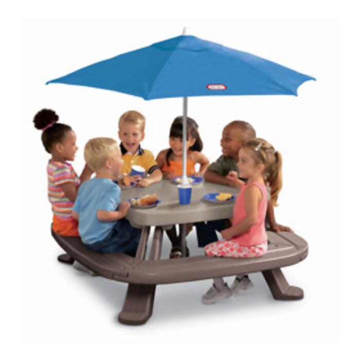 A Mesa Picnic com Guarda-Sol Little Tikes é ideal para chácaras, condomínios e escolas para atividades em grupo.
