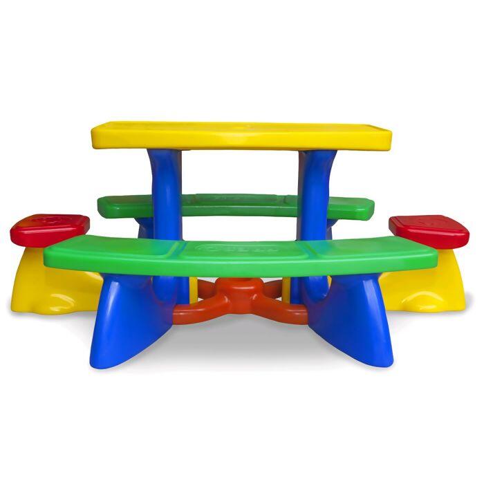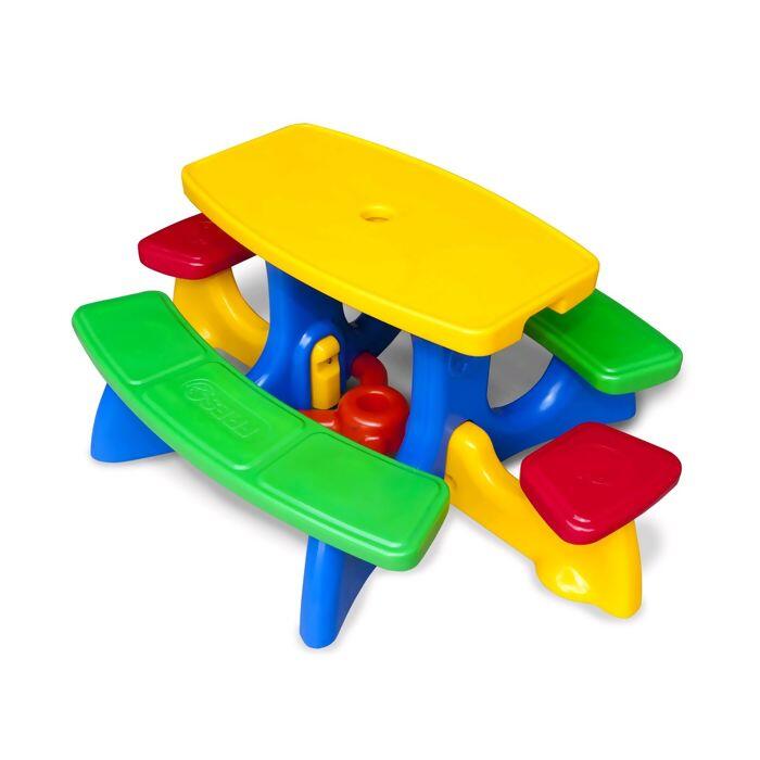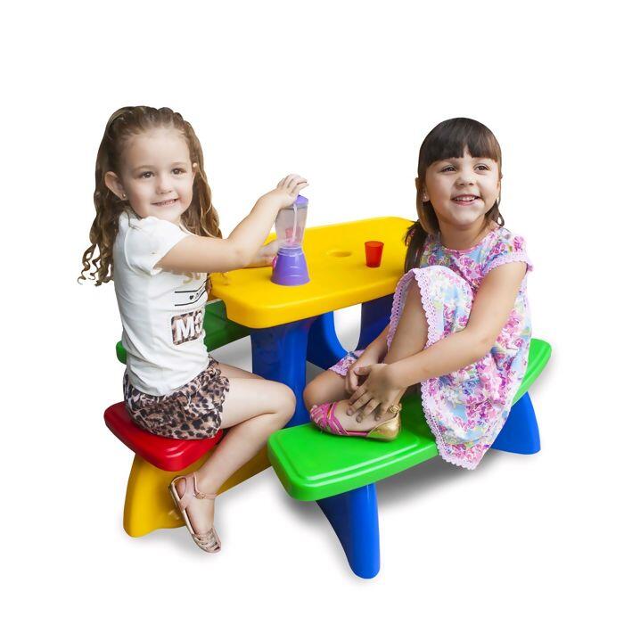 Mesinha “pic-nic” com bancos acoplados para acomodar 3 crianças de cada lado e mais 2 lugares individuais nas extremidades. Totalmente em plástico rotomoldado. O tampo da mesa contém furo central para instalação de guarda-sol (não incluso). Todos os assentos ficam a uma altura de 25,0 cm do chão (topo do assento) e embaixo da mesa é instalada uma peça em “X” ao nível do chão para facilitar a fixação do guarda-sol(não incluso).