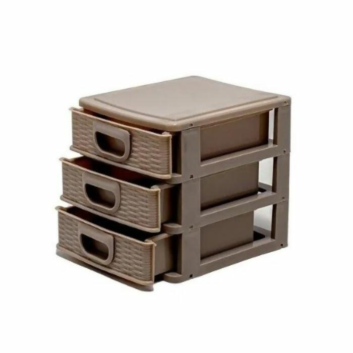 Mini gaveteiro de mesa para guardar pequenos objetos, como maquiagens, bijuterias, materiais de escritório. Fabricado em plástico com um design que lembra rattan. Deixa qualquer ambiente muito mais charmoso e organizado.