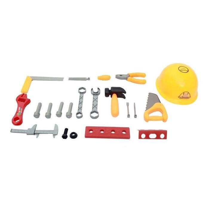 Conteúdo da embalagem: 01 bancada de ferramentas, 01 capacete, 01 cartela de adesivos, 05 pregos, 01 grifo, 01 alicate, 01 esquadro, 01 martelo, 01 serrote, 01 paquímetro, 12 parafusos, 12 porcas, 01 chave estrela e 01 chave combinada.