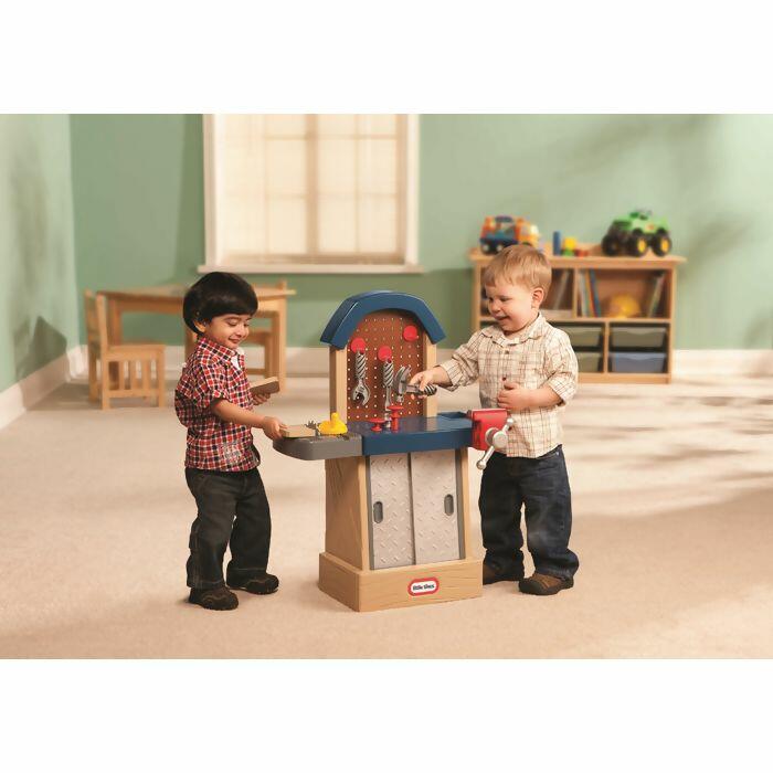 Oficina Marceneiro Little Tikes Este divertido brinquedo vem com diversos acessórios onde as crianças podem serrar madeira, pregar e muito mais. A Oficina é resistente e tem o tamanho certo para qualquer ambiente dentro de casa. As portas de correr oferecem muito espaço de armazenamento. Grande o suficiente para as crianças brincarem juntas. Esta bancada contêm 11 acessórios: 1 chave de fenda, 1 martelo, 1 grifo, 1 serra, 2 pedaços de madeira, 1 morsa, 2 pregos, 2 parafusos, 1 bandeja e 3 ganchos.Atenção: Este produto deve ser montado somente por um adulto.