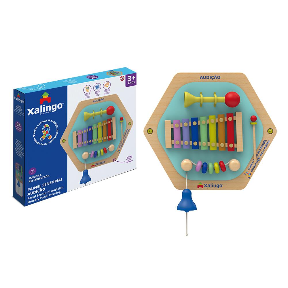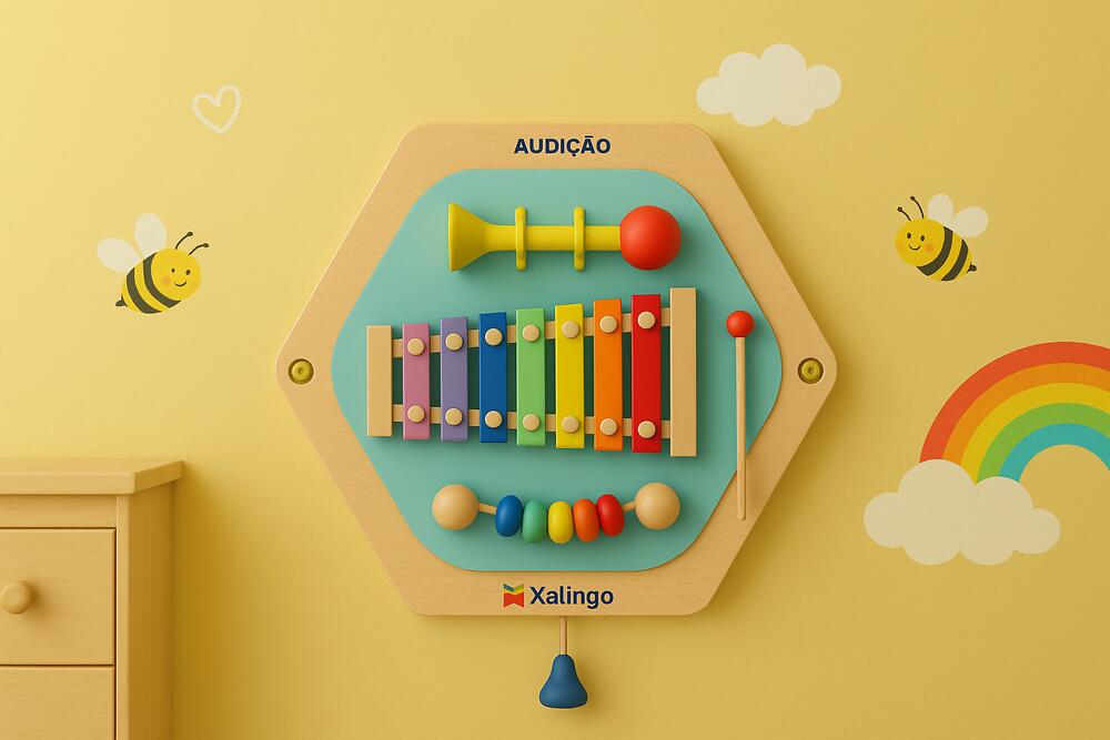 Descrição Painel Sensorial Audição com 04 Atividades Musicais Xalingo